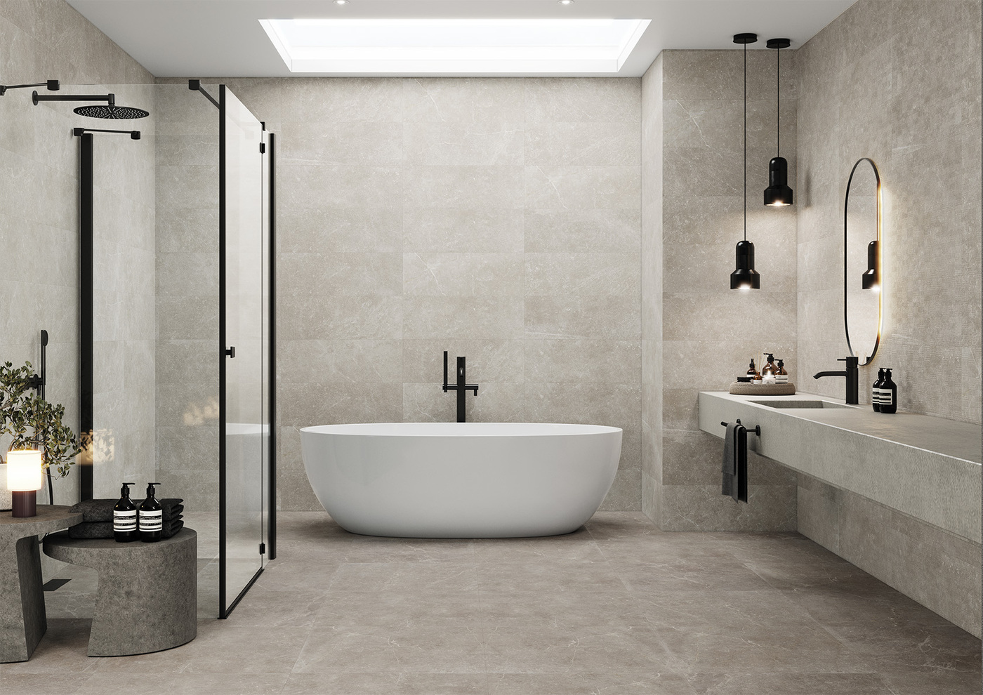 Colecția Bleuemix de la Keraben reproduce piatra albastră belgiană, un tip de calcar caracterizat prin prezența a numeroase fosile marine care ies în evidență pe un fundal întunecat care variază de la gri deschis la negru printr-o gamă de tonuri albăstrui.
